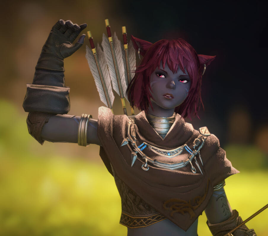 Pets: A large wolf companion named PercyPhysical Appearance: Vila is short for a miqo'te and she has a slim, athletic build. Her dark skin bears multiple scars as testament to her profession. The most notable of which would be the scar over her left eyebrow and a deep scar on her right shoulder. She also has blue clan tattoos over her arms, hips, and legs as well as a tattoo on her right inner forearm of an arrow with a flower blooming from the center of the shaft.